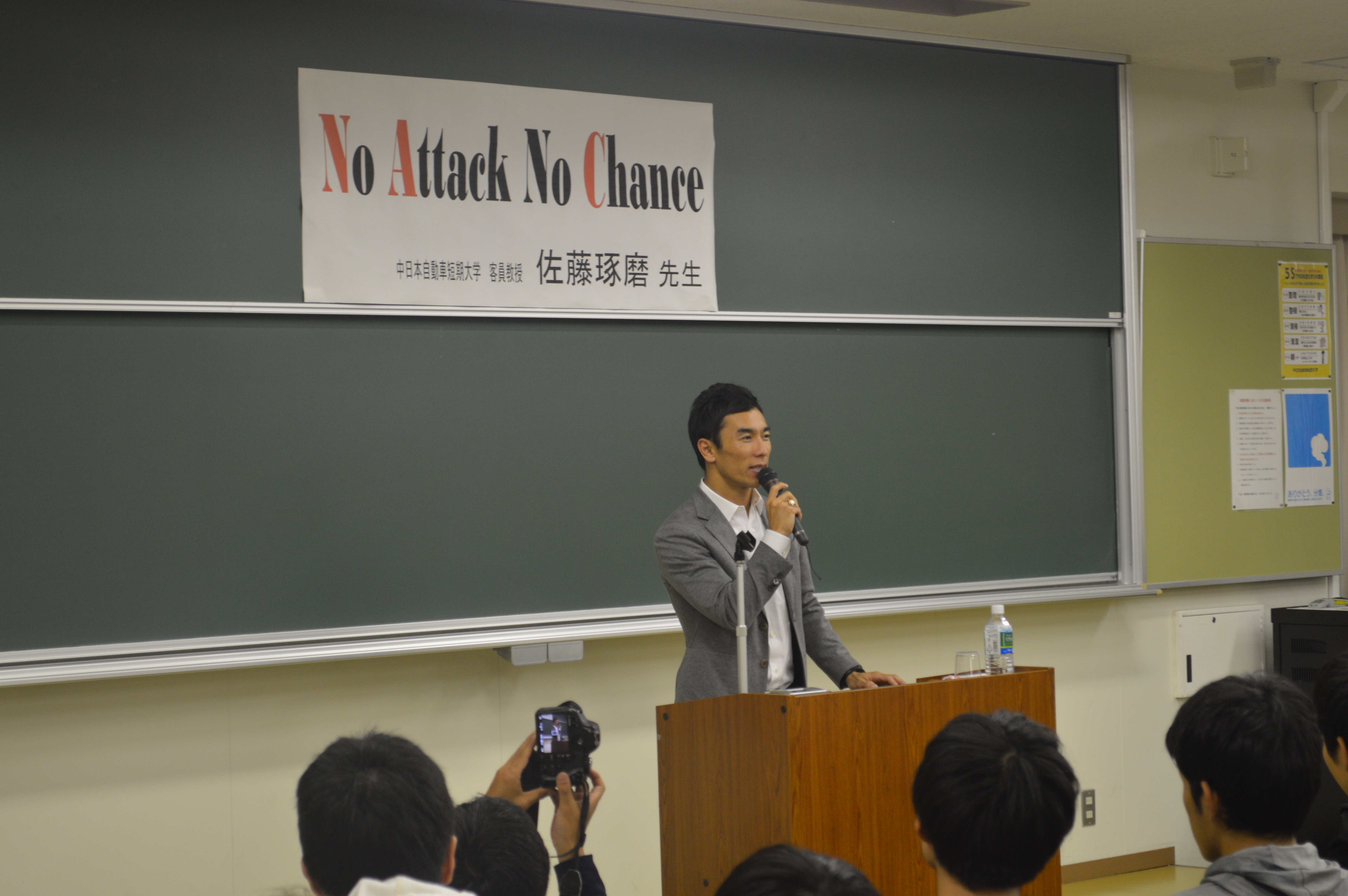 佐藤琢磨氏による学生対象の特別講義は、今年度も10月31日(水)に本学及び系列校の中日本航空専門学校(岐阜県関市)にて行ないます。自身の座右の銘である「No Attack No Chance」を講義のテーマとし、挑戦し続ける姿勢の大事さや、海外のレースで活躍する一流ドライバーから見た、メカニックの役割や高性能マシンを扱うレーサーの立場から整備の重要性などを講義していただきます。